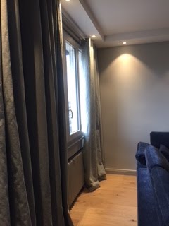 Deuxième série de rideaux confectionnés en LINARA de chez Romo. La palette de teintes se prête idéalement au ton sur ton, en vert amande ici dans un appartement moderne de Lyon.